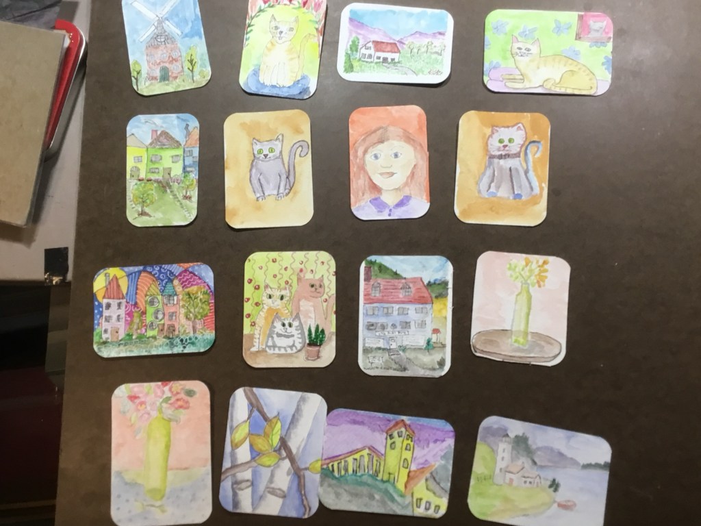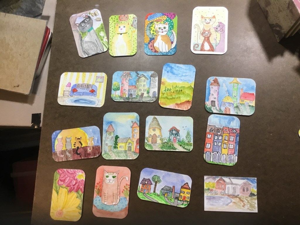 There are a lot of cat paintings because I’m the cat lady of the family. Some plants, lots of wonky houses make up the rest. I started adding people toward the end. Maybe for the next paintings, I could do more people.
