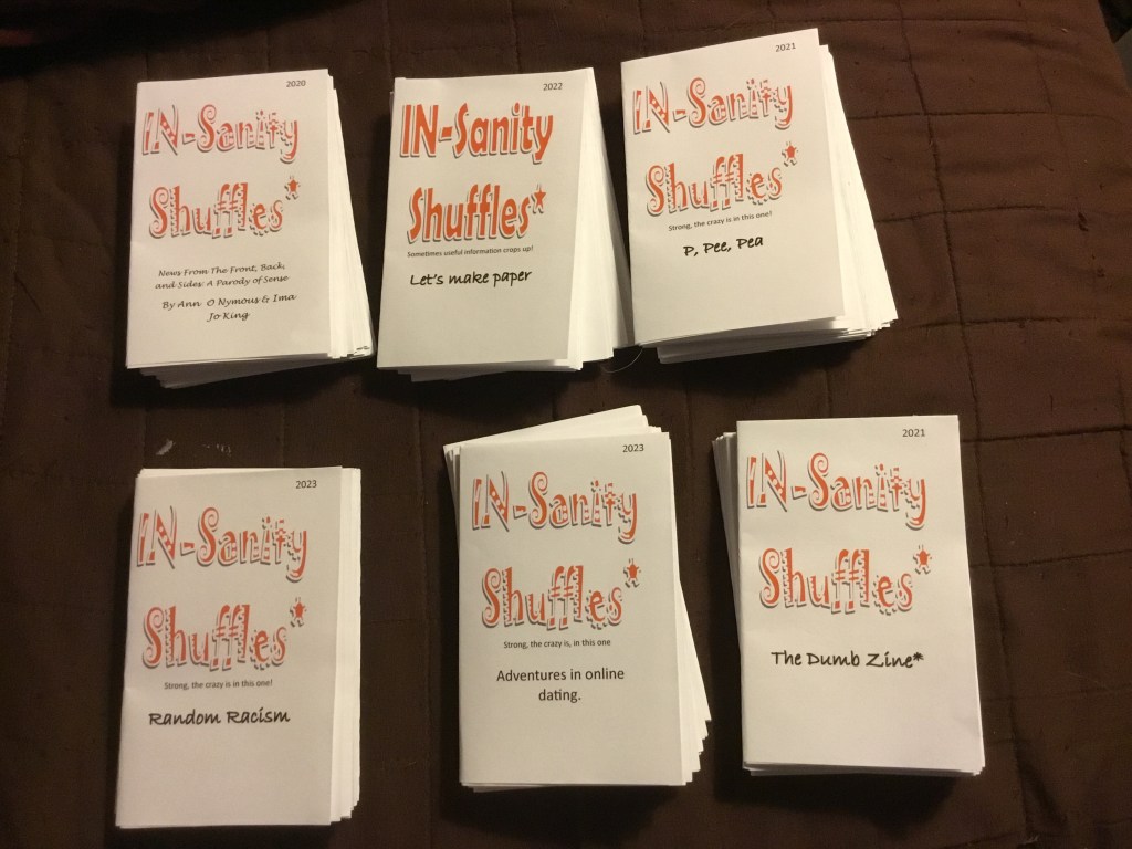 I’ve included a photo of the zines I’ll be selling. The Title is Insanity Shuffles because as it says on the back, “Insanity doesn’t just run in my family. It slinks, oozes, shuffles. Occasionally, it cartwheels, jumps, strides, pounces, and gavottes.” They’re essays and other items that may or may not be interesting. That’s the story and I’m sticking to it.