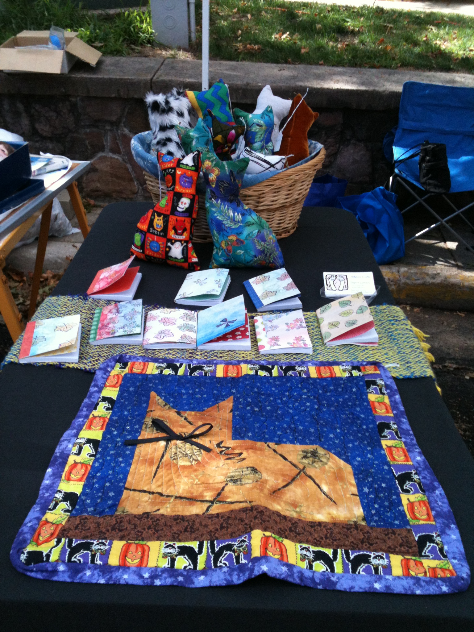 This was my first setup. The table is at an angle to the booth – not my choice. It was the only way to make it fit after my friend had already set up. I’m not sure if I had a sign or not indicating what the prices were for the cats and notebooks. The mat in the foreground was priced at $30 because I didn’t really want to sell it. It was there to fill in space. I made no money that day.